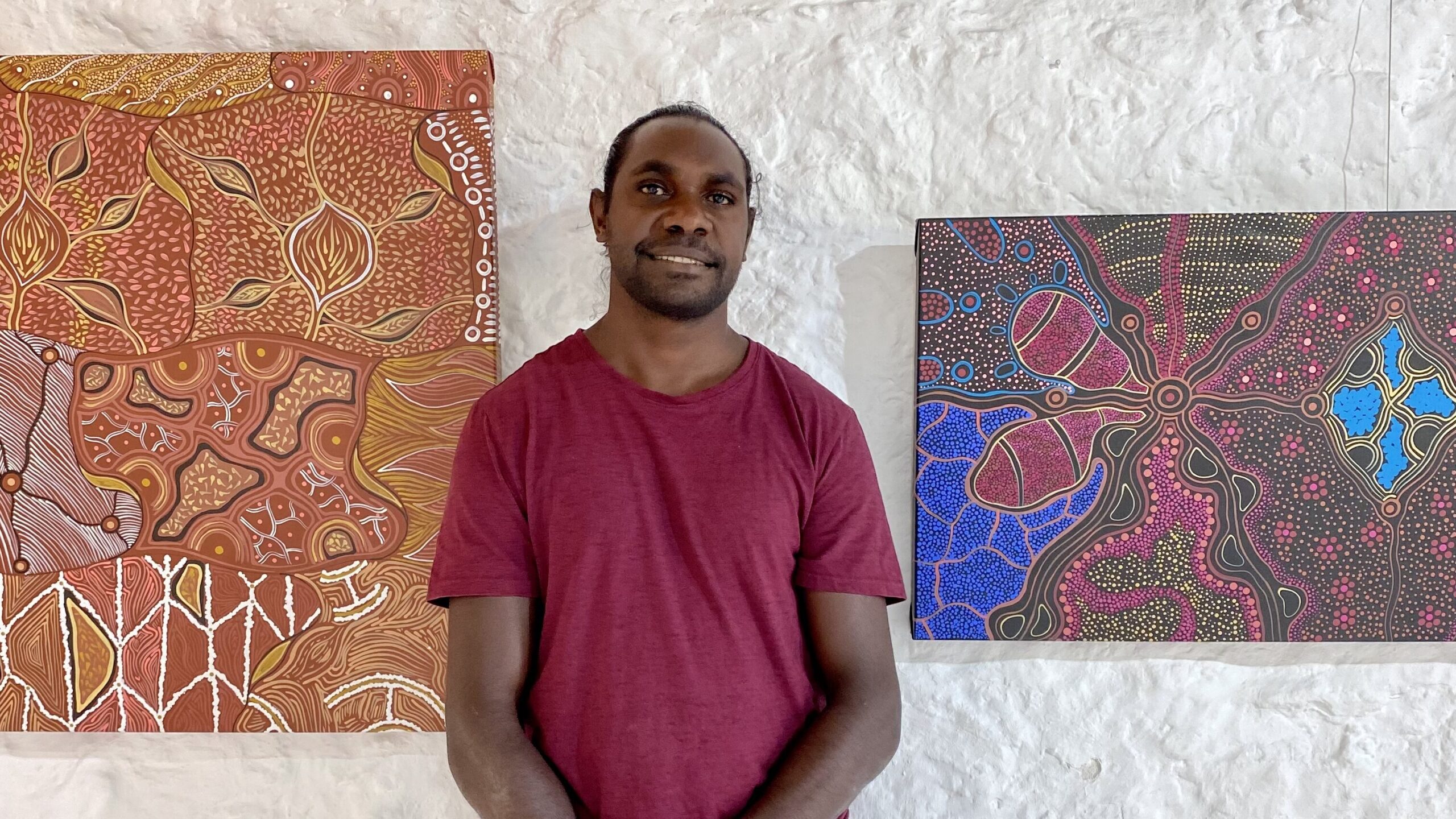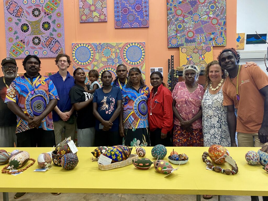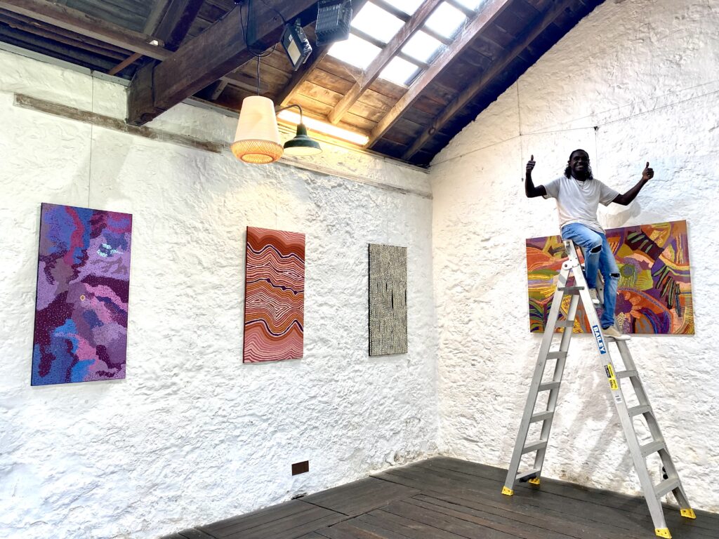 EXHBITIONS2022 – Kidogo Arthouse Duo Exhibition with Ilona McGuire Kenneth is a Leader in the Yiyili Community art gallery, Girrawarli Art & Cultural Centre Hanging the stunning artwork by Warlayirti Artists from Balgo Community.
