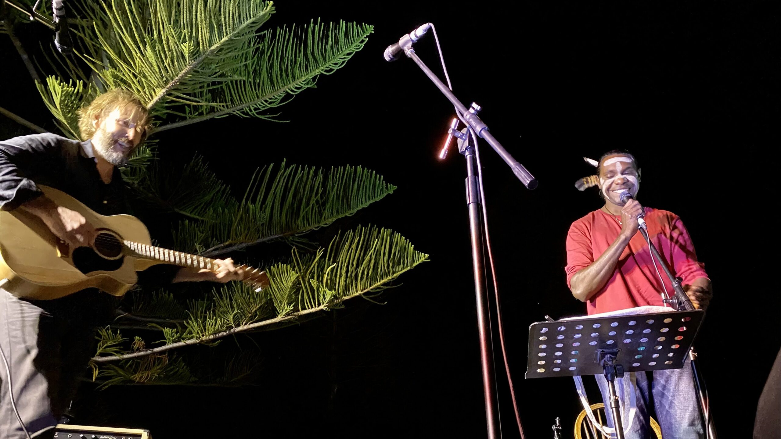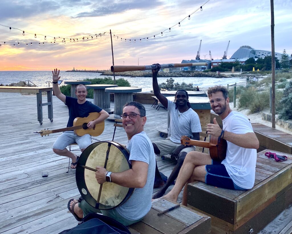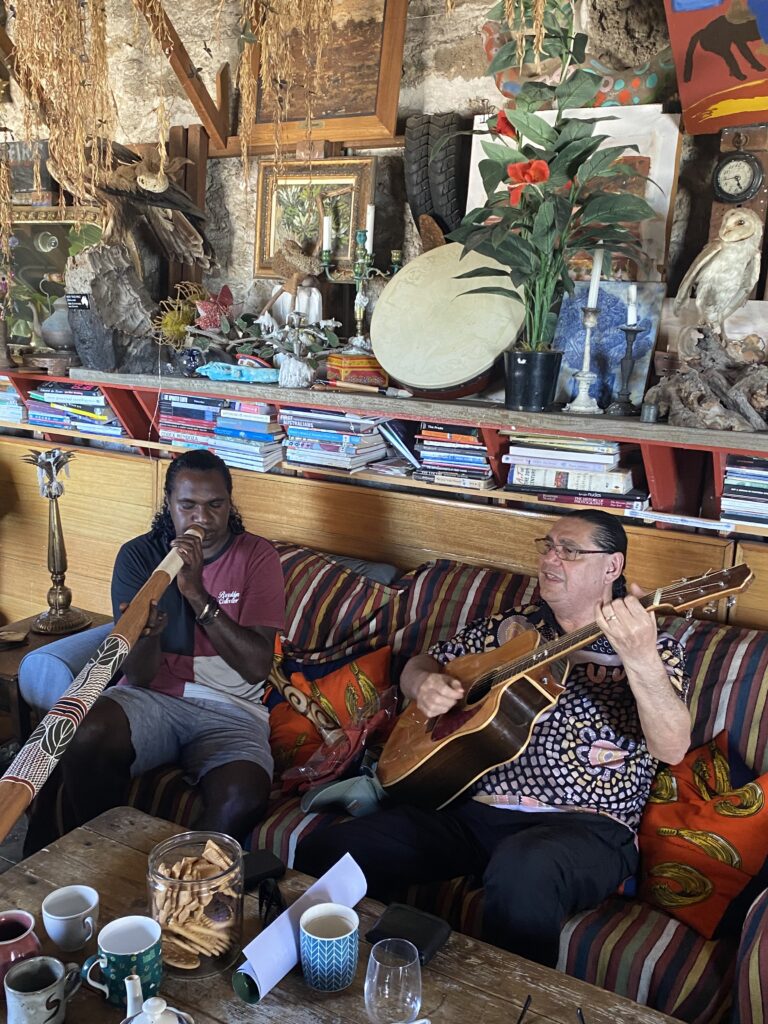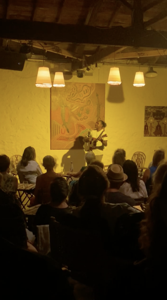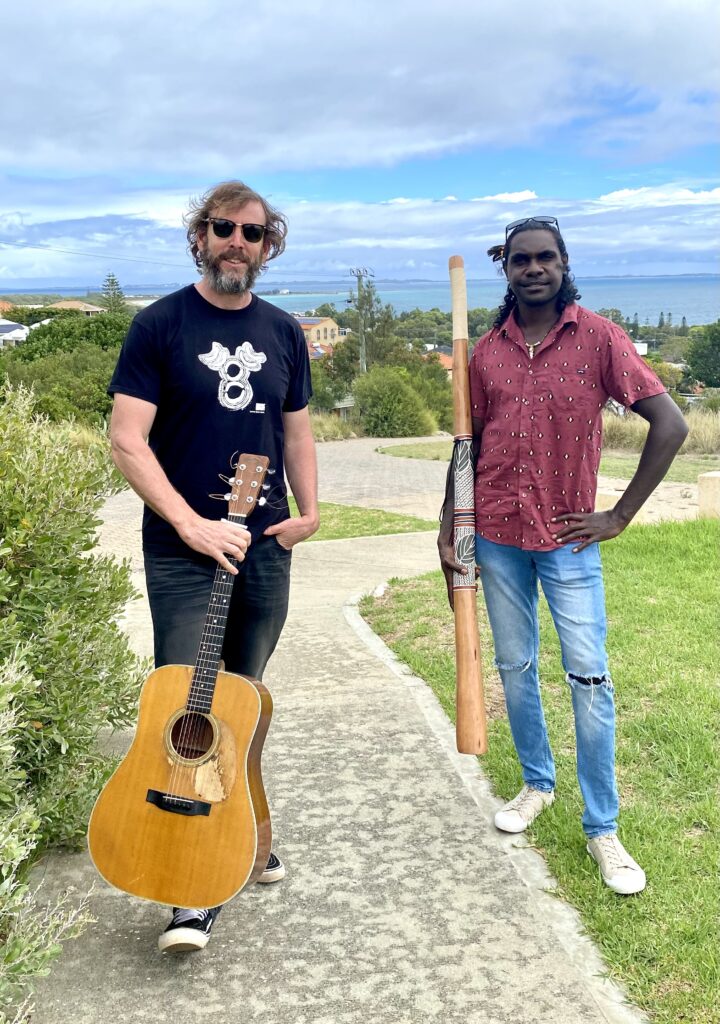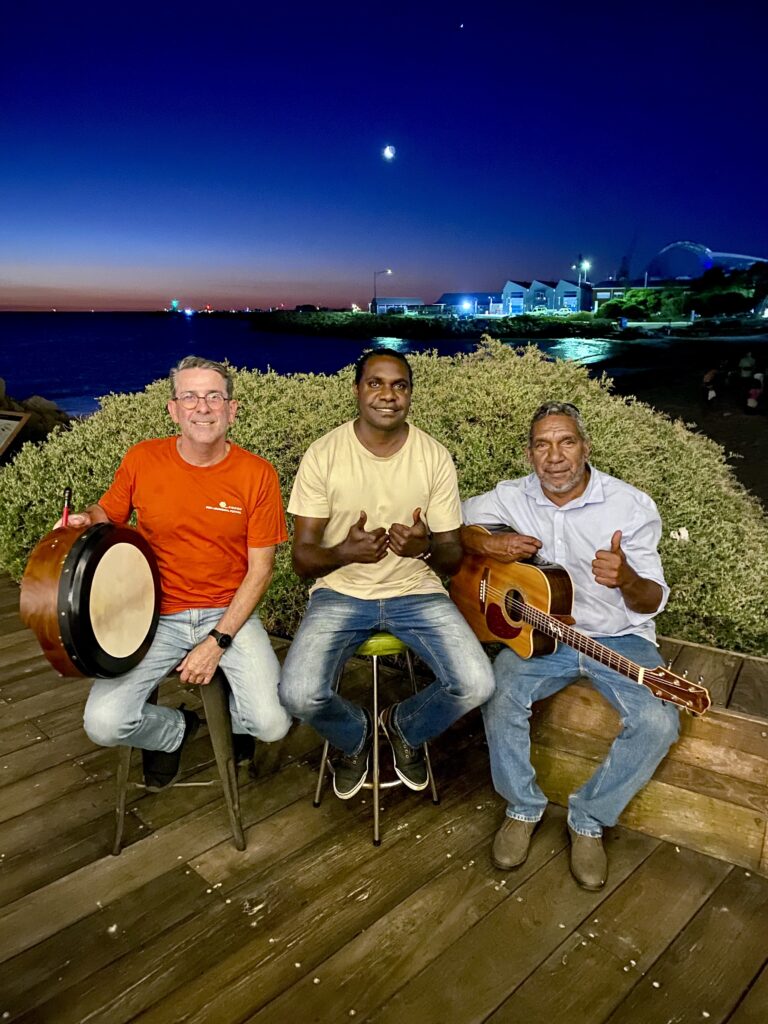PERFORMANCE Didgeridoo Performance Singing in Traditional Language Traditional Dance Performance Demonstrating Painting Techniques and explaining Aboriginal Symbols in Art Collaborating with Dublin songwriter John Barrett With John Clare (Dublin) and Paul Cox (Yiyili) Performing on 92.1FM radio in Perth, 2023 Playing with Broome comedian & musician, Mark Bin Rehearsing with Ciaran O’Sullivan and friends. Performing at “KMAM Single-Mic Sessions”, Fremantle 2024 Kenneth performing at the Kidogo Irish Aboriginal Festival ORIGINAL SONGS “Bilidi Binyirri Yirridjangga” – “Guided by Strong Spirits” https://dreamtimetopresent.com.au/wp-content/uploads/2024/07/Bilidi-Binyirri-Yirridjangga-Master-1-CP-.mp3 “Girlwanggi” – “Old People” DEMONSTRATING PAINTING TECHNIQUES & EXPLAINING ABORIGINAL SYMBOLS IN ART More videos of Kenneth explaining his painting can be found here